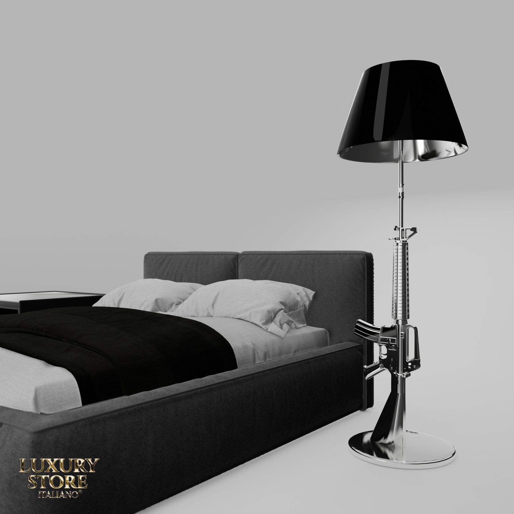 Porta un tocco di provocazione sofisticata nei tuoi ambienti, la lampada รจย un pezzo dโ€™arredo che unisce arte, design e carattere. Alta 170 cm con una base di 40 cm, questa lampada scultorea riproduce con sorprendente realismo la sagoma di un fucile M16, trasformandola in un oggetto di luce dal forte impatto estetico.